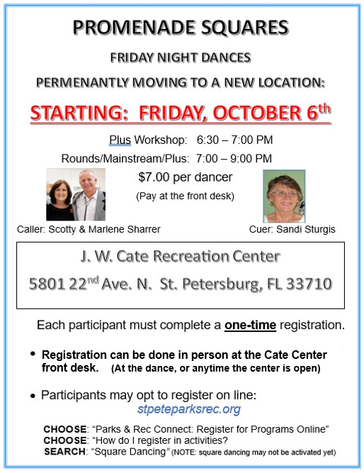 Almost every Friday evening except holidays Sign up for our weekly eMail newsletter or read it on the DANCERgram Alternating Rounds, Mainstream & Plus 7:00-9:00 pm Square Dance Workshop Tip 6:30-7:00 pm ************************************************************************************ J. W. Cate Center 5801 22nd Ave. N. St. Petersburg, FL 33710 |