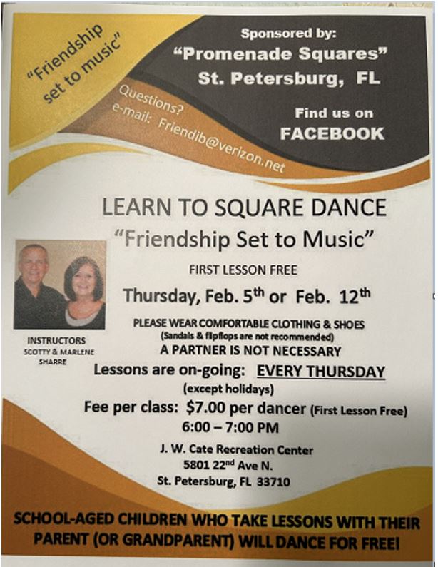 Tuesdays - Tampa Bay Rounds Classes Thursdays Starting February 5, 2026 - Square Dance Lessons Read the Promenade Squares Newsletter for more information click the link below |
