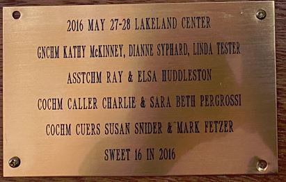 | 2016 | LAKELAND CENTER | SWWEET 16 IN 2016 | KATHY McKINNEY, DIANNE SYPHARD, LINDA TESTER | RAY & ELSA HUDDLESTON | CHARLIE & SARA BETH PERGROSSI | SUSAN SNIDER & MARK FETZER |  |