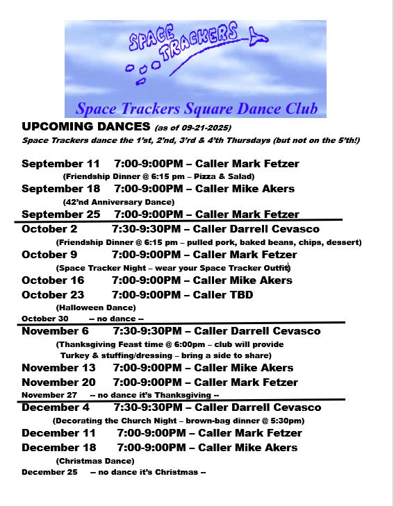 ![]() Space Trackers Square Dance Club web page updated 09/21/2025 |