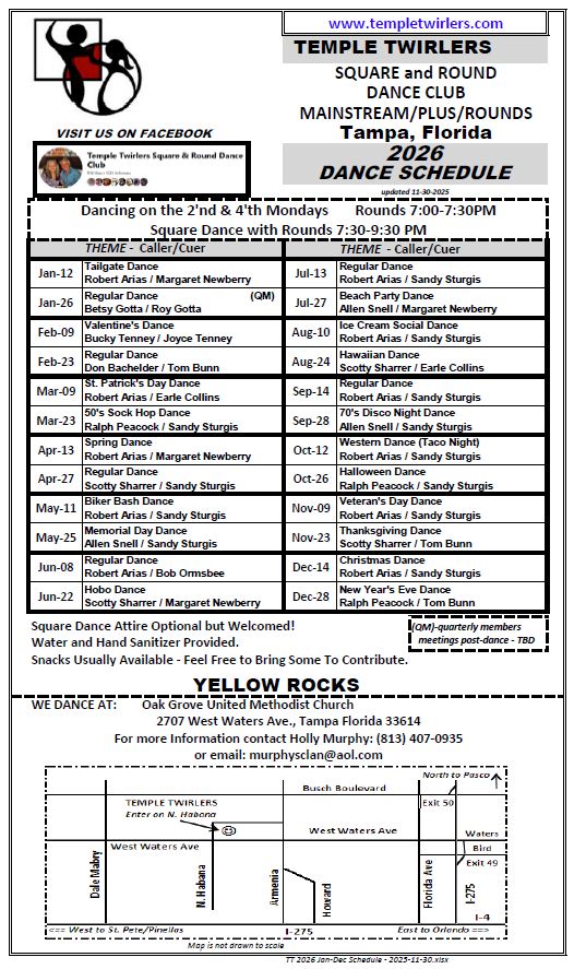 Temple Twirlers Square and Round Dance Club Oak Grove United Methodist Church 2707 West Waters Avenue Tampa, FL 33614 Corner of West Waters and North Habana Hall Entrance on Habana ..click here for a map and directions |