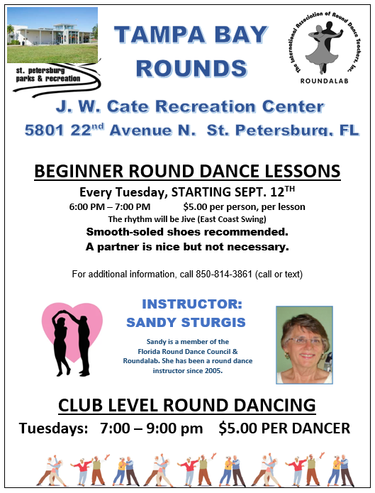 Almost every Friday evening except holidays Sign up for our weekly eMail newsletter or read it on the DANCERgram Alternating Rounds, Mainstream & Plus 7:00-9:00 pm Square Dance Workshop Tip 6:30-7:00 pm ************************************************************************************ J. W. Cate Center 5801 22nd Ave. N. St. Petersburg, FL 33710 |