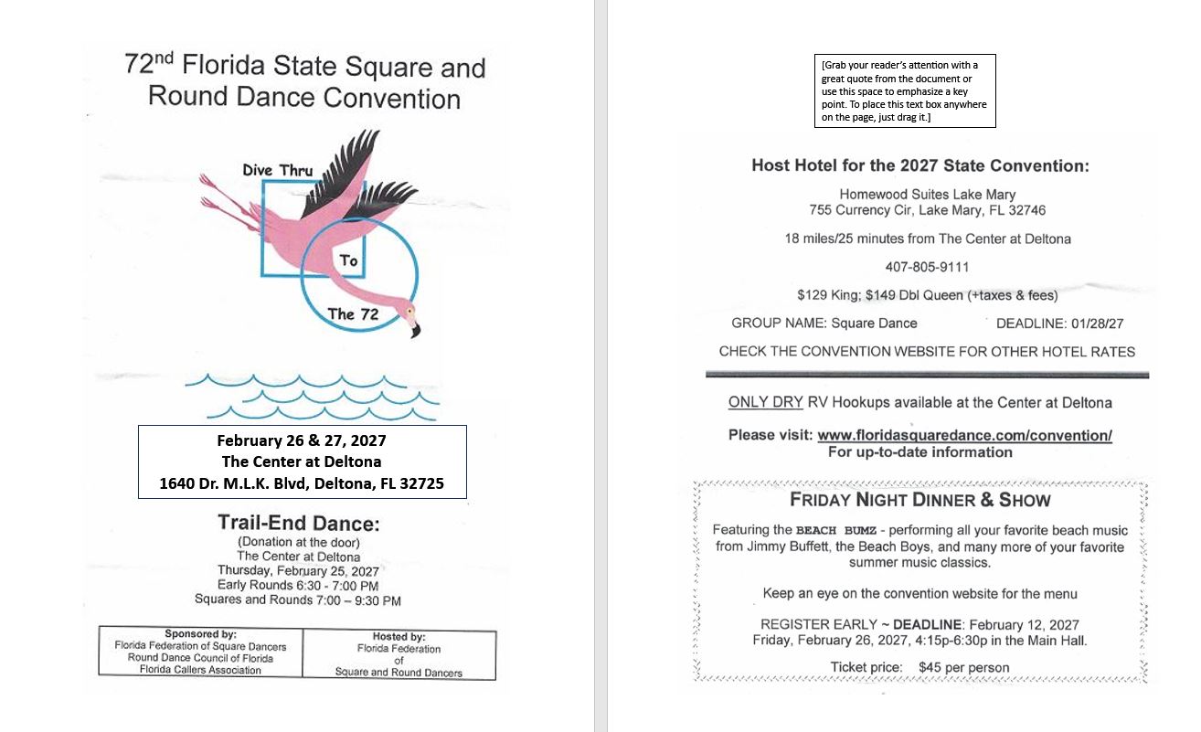72'nd Florida State Square & Round Dance Convention February 26-27, 2027 Trail-End Dance February 25, 2027
