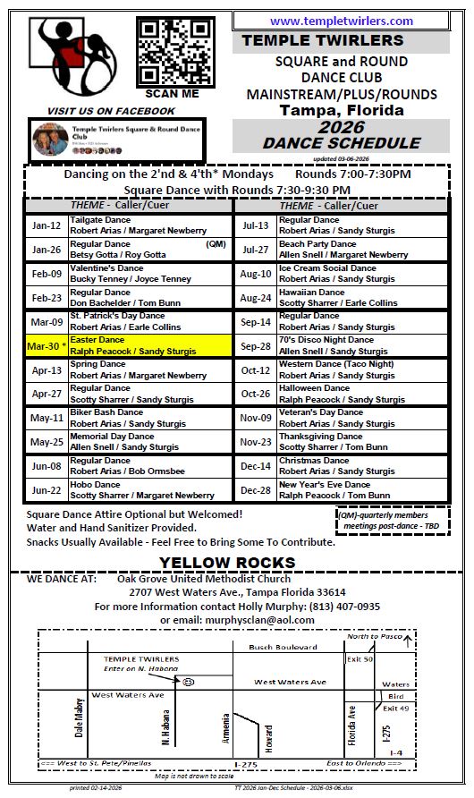 Temple Twirlers Square and Round Dance Club Oak Grove United Methodist Church 2707 West Waters Avenue Tampa, FL 33614 Corner of West Waters and North Habana Hall Entrance on Habana ..click here for a map and directions |